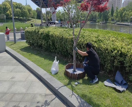 在施工現(xiàn)場,養(yǎng)護人員將回收木樁截取統(tǒng)一長度,精心配色組合使用環(huán)保彩漆涂刷橫截面,將原本單調(diào)的樹穴打造為充滿藝術(shù)氣息的“五彩景框”,顯著提升了公園整體景觀效果。