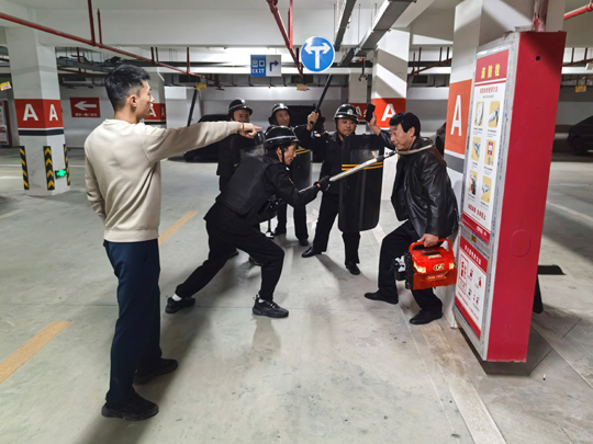 與此同時,應急處置崗隊員也攜帶防暴盾牌、橡膠棍等專業(yè)器械火速集結,以最快速度抵達地下車庫指定區(qū)域。面對負隅頑抗的 “盜竊分子”,隊員們沉著冷靜,憑借日常訓練形成的默契配合,迅速結成戰(zhàn)術小組,從不同方向?qū)?“盜竊分子” 實施包圍,果斷出擊、動作規(guī)范,僅用數(shù)分鐘便成功將其治服,并移送公安機關處理。