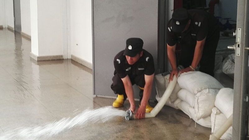 本次演練主要結(jié)合項目實際情況,在突發(fā)暴雨災(zāi)害發(fā)生時,重點針對校園設(shè)備機房等重點區(qū)域,設(shè)置警戒,快速疏散現(xiàn)場人員及車輛,作利用防汛工具緊急排險,有效排除現(xiàn)場積水。
