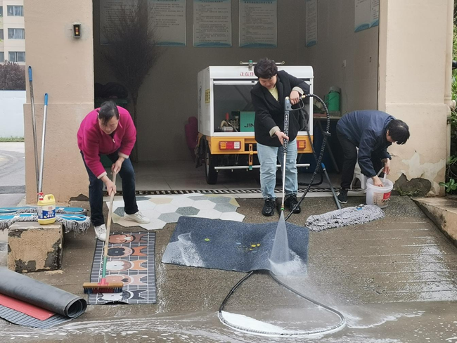 工作人員幫業(yè)主們清洗著臟臟的地毯,用高壓水槍耐心、仔細沖洗著地毯的正反面,小舉動,大關(guān)懷,每一次蹲下與起身,帶來的都是地墊的嶄新如初。