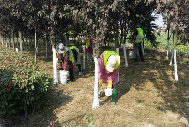 樹干涂白,目的是防治病蟲害和延遲樹木萌芽,還可以提高苗木抗寒、抗病蟲害能力,保樹木安全過冬,為明年樹木良好生長(zhǎng)打下基礎(chǔ)。